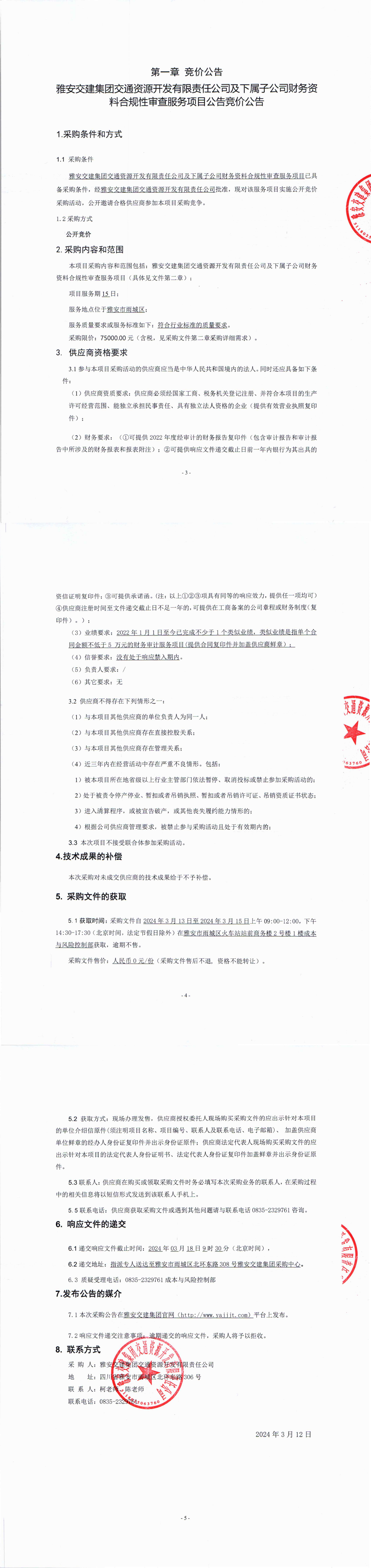 雅安交建集團(tuán)交通資源開發(fā)有限責(zé)任公司及下屬子公司財(cái)務(wù)資料合規(guī)性審查服務(wù)項(xiàng)目公告競價(jià)公告