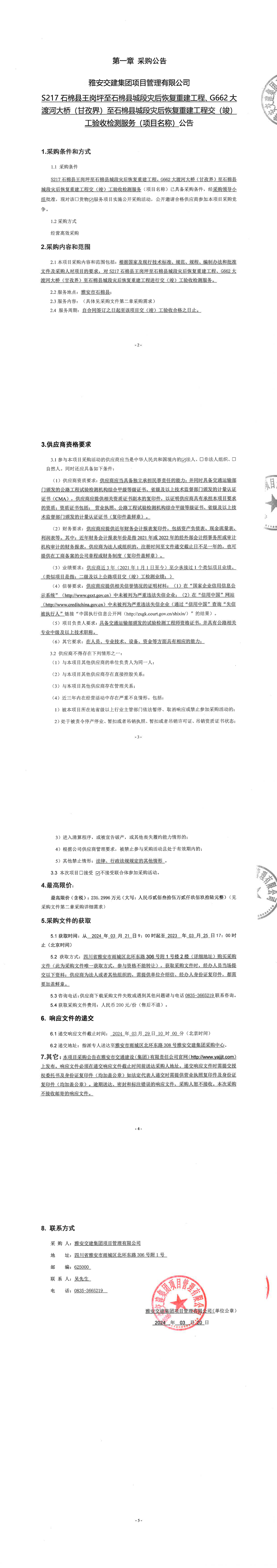 雅安交建集團(tuán)項(xiàng)目管理有限公司S217石棉縣王崗坪至石棉縣城段災(zāi)后恢復(fù)重建工程、G662大渡河大橋(甘孜界)至石棉縣城段災(zāi)后恢復(fù)重建工程交(竣)工驗(yàn)收檢測服務(wù)(項(xiàng)目名稱)公告