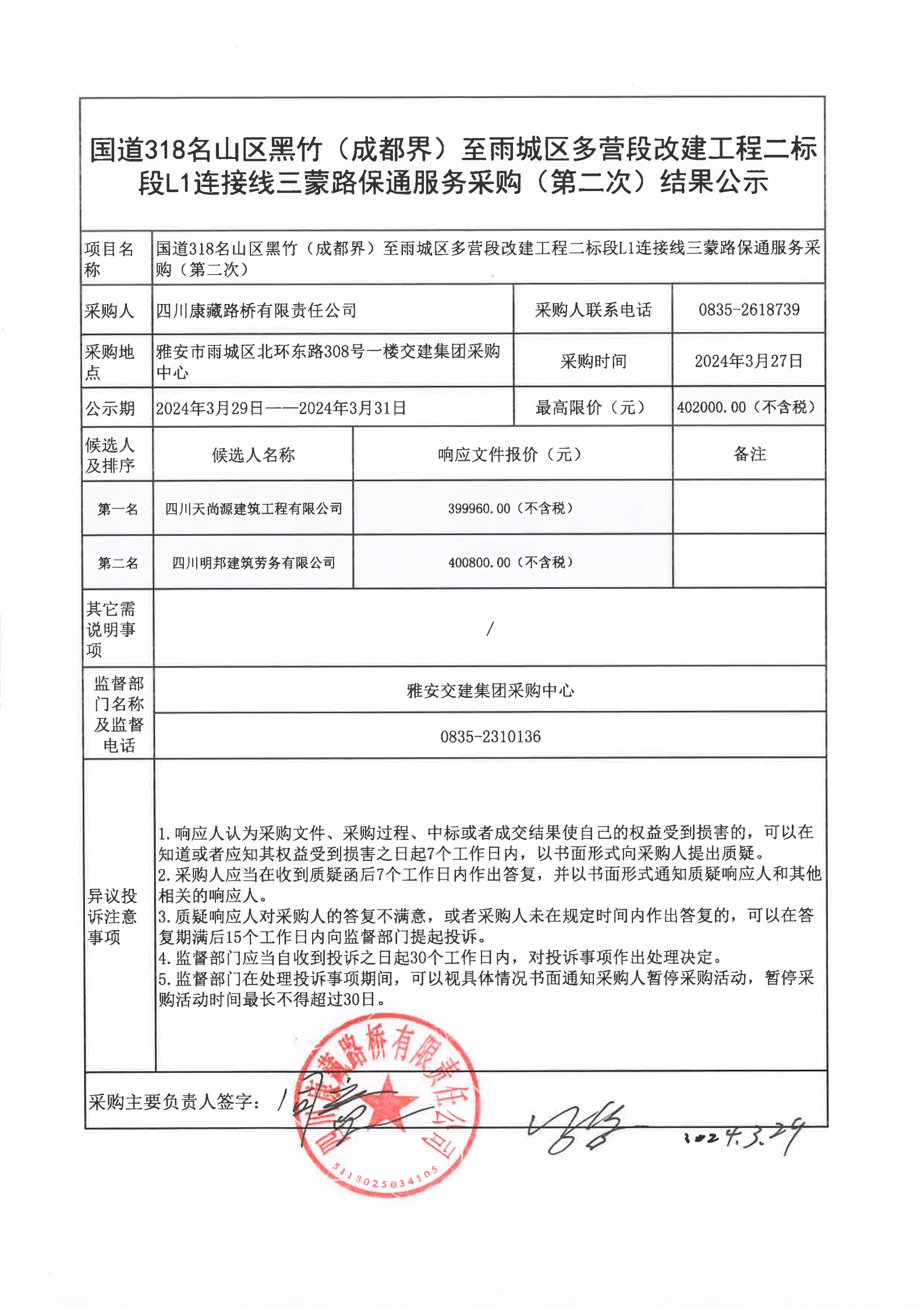 四川康藏路橋有限責任公司國道318名山區(qū)黑竹(成都界)至雨城區(qū)多營段改建工程二標段L1連接線三蒙路保通服務(第二次)結果公示