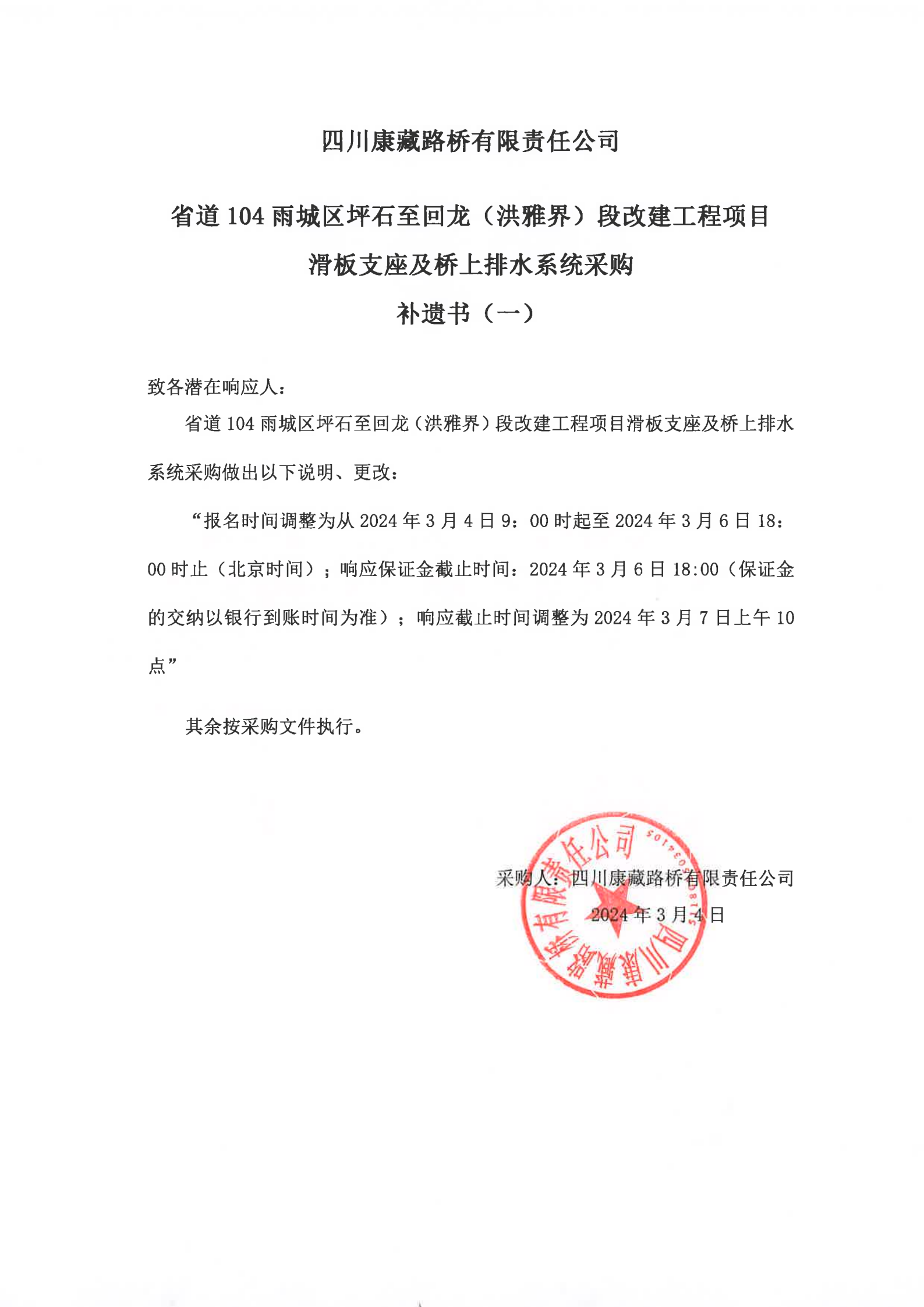 四川康藏路橋有限責任公司省道104雨城區(qū)坪石至回龍(洪雅界)段改建工程項目滑板支座及橋上排水系統(tǒng)采購補遺書(一)