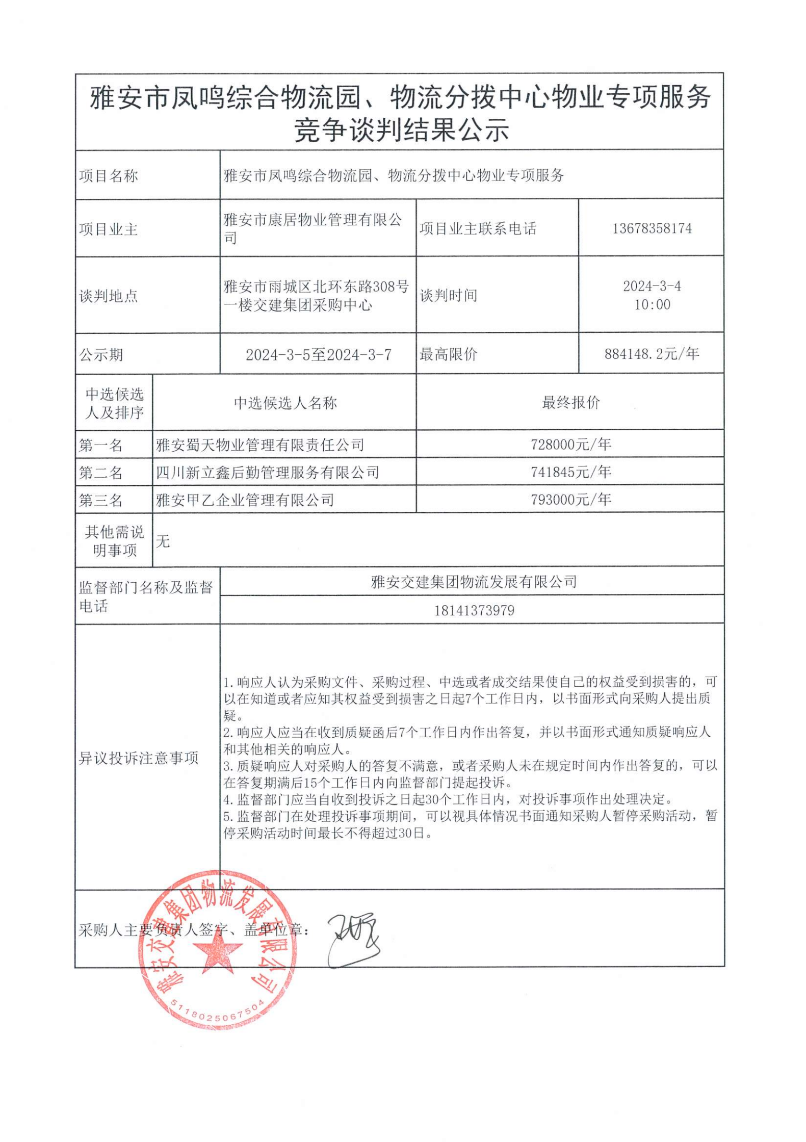 雅安市康居物業(yè)管理有限公司雅安市鳳鳴綜合物流園、物流分撥中心物業(yè)專項(xiàng)服務(wù)競爭談判結(jié)果公示