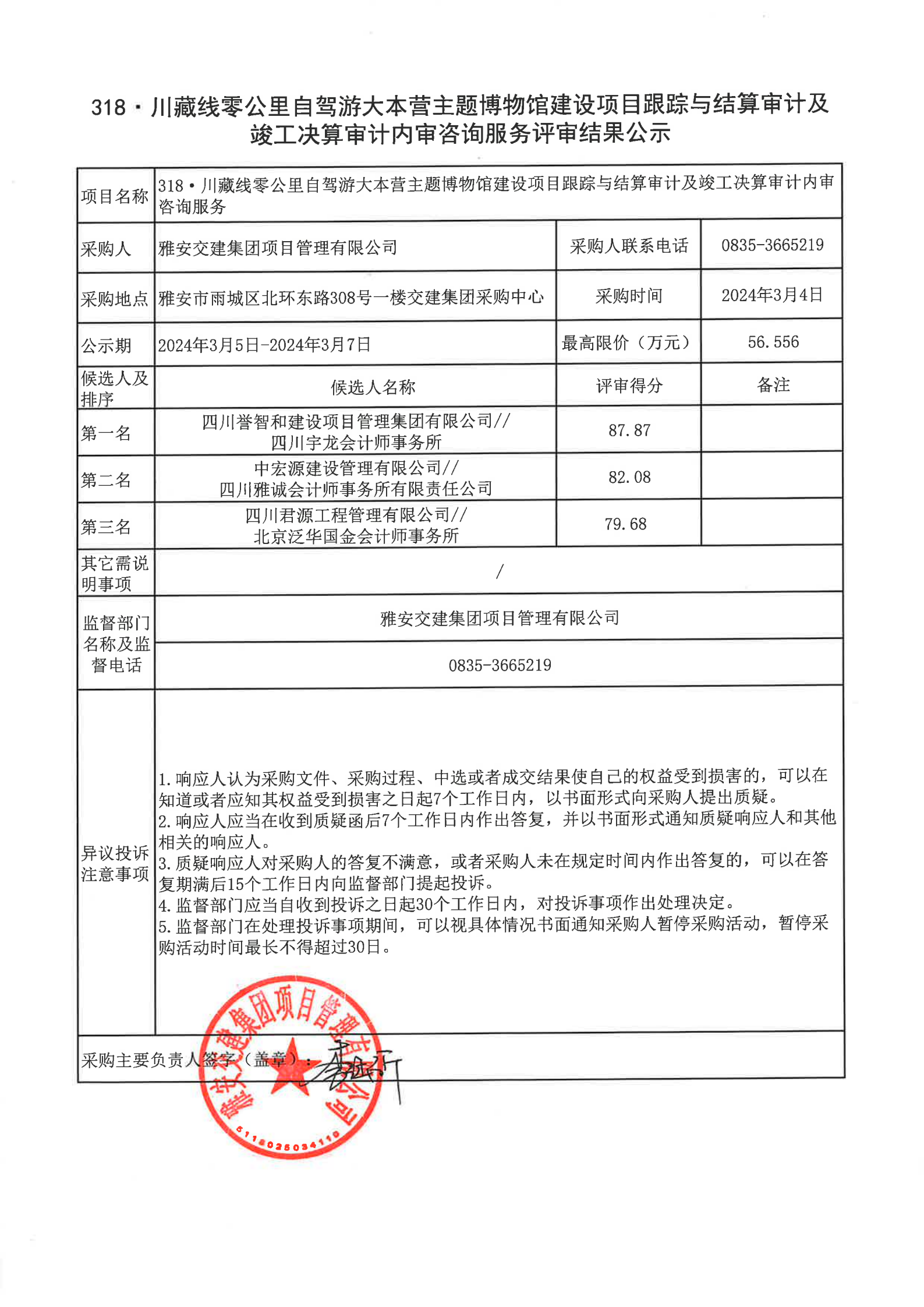 雅安交建集團項目管理有限公司318·川藏線零公里自駕游大本營主題博物館建設項目跟蹤與結(jié)算審計及竣工決算審計內(nèi)審咨詢服務評審結(jié)果公示