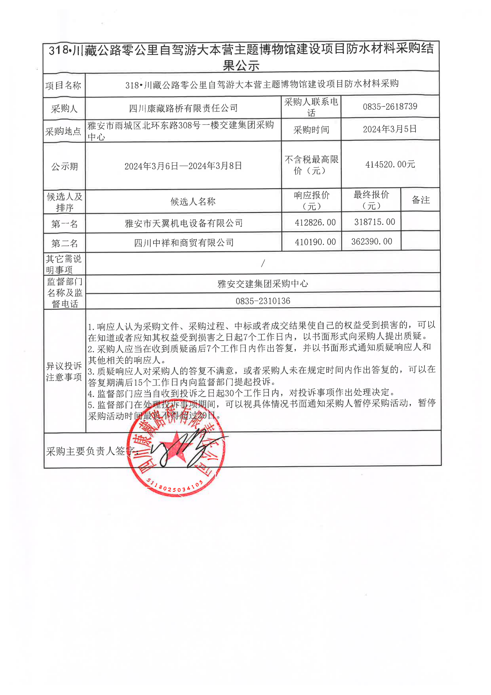 四川康藏路橋有限責(zé)任公司318·川藏公路零公里自駕游大本營主題博物館建設(shè)項(xiàng)目防水材料采購結(jié)果公示