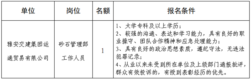 根據(jù)發(fā)展需要,決定面向社會公開招聘雅安市交通建設(shè)(集團)有限責(zé)任公司(以下簡稱“雅安交建集團”)所屬子公司工作人員1名,現(xiàn)將有關(guān)事項公告如下: