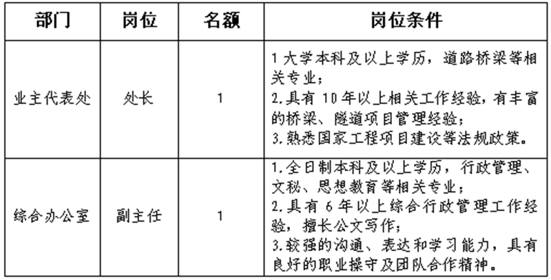 根據(jù)發(fā)展需要,決定面向社會公開招聘雅安市交通建設(shè)(集團(tuán))有限責(zé)任公司(以下簡稱“雅安交建集團(tuán)”)所屬子公司相關(guān)人員2名,現(xiàn)將有關(guān)事項(xiàng)公告如下: