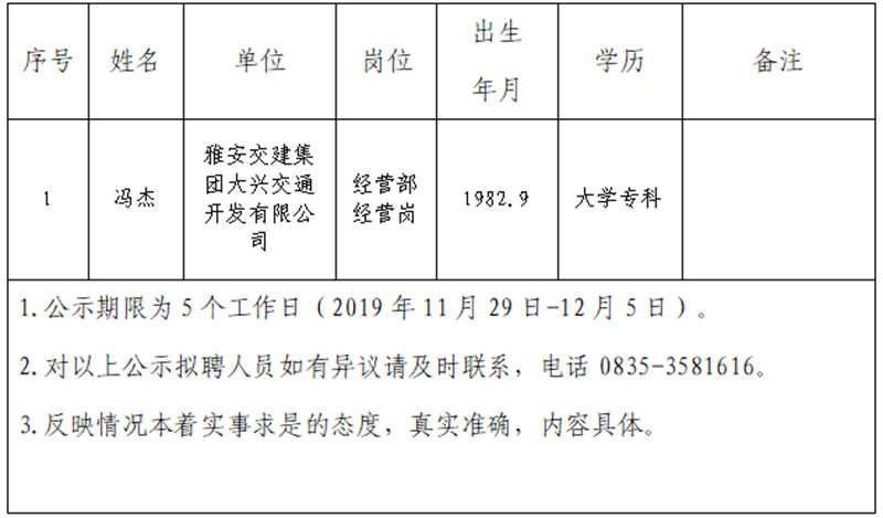 雅安交建集團子公司擬聘用人員公示(大興公司)