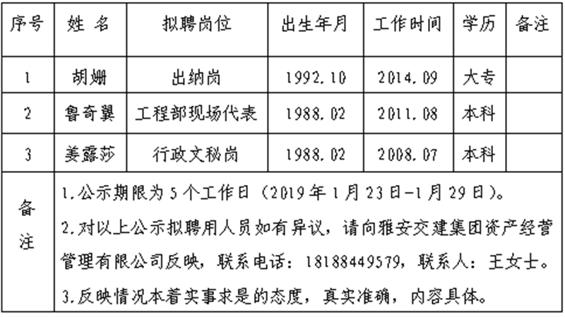 雅安交建集團資產(chǎn)經(jīng)營管理有限公司擬聘用人員公示