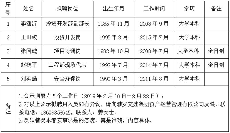 通過(guò)公開報(bào)名、資格審查、筆試、面試等程序,經(jīng)雅安交建集團(tuán)資產(chǎn)經(jīng)營(yíng)管理有限公司研究,對(duì)以下5名擬聘用人員予以公示: