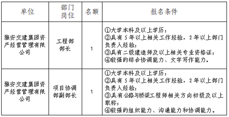 根據(jù)發(fā)展需要,決定面向社會公開招聘雅安市交通建設(shè)(集團(tuán))有限責(zé)任公司(以下簡稱“雅安交建集團(tuán)”)所屬子公司工作人員2名,現(xiàn)將有關(guān)事項公告如下: