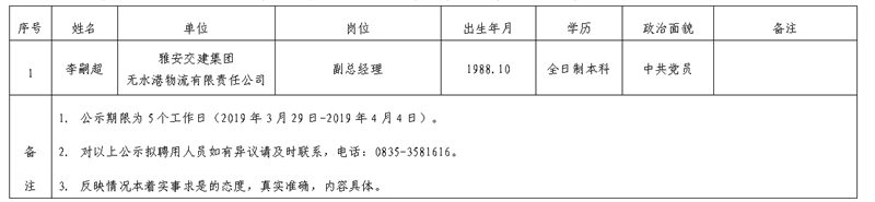 雅安交建集團(tuán)子公司擬聘用人員公示(無(wú)水港物流公司)
