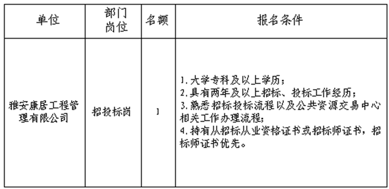 根據(jù)發(fā)展需要,決定面向社會(huì)公開(kāi)招聘雅安市交通建設(shè)(集團(tuán))有限責(zé)任公司(以下簡(jiǎn)稱(chēng)“雅安交建集團(tuán)”)所屬子公司工作人員1名,現(xiàn)將有關(guān)事項(xiàng)公告如下: