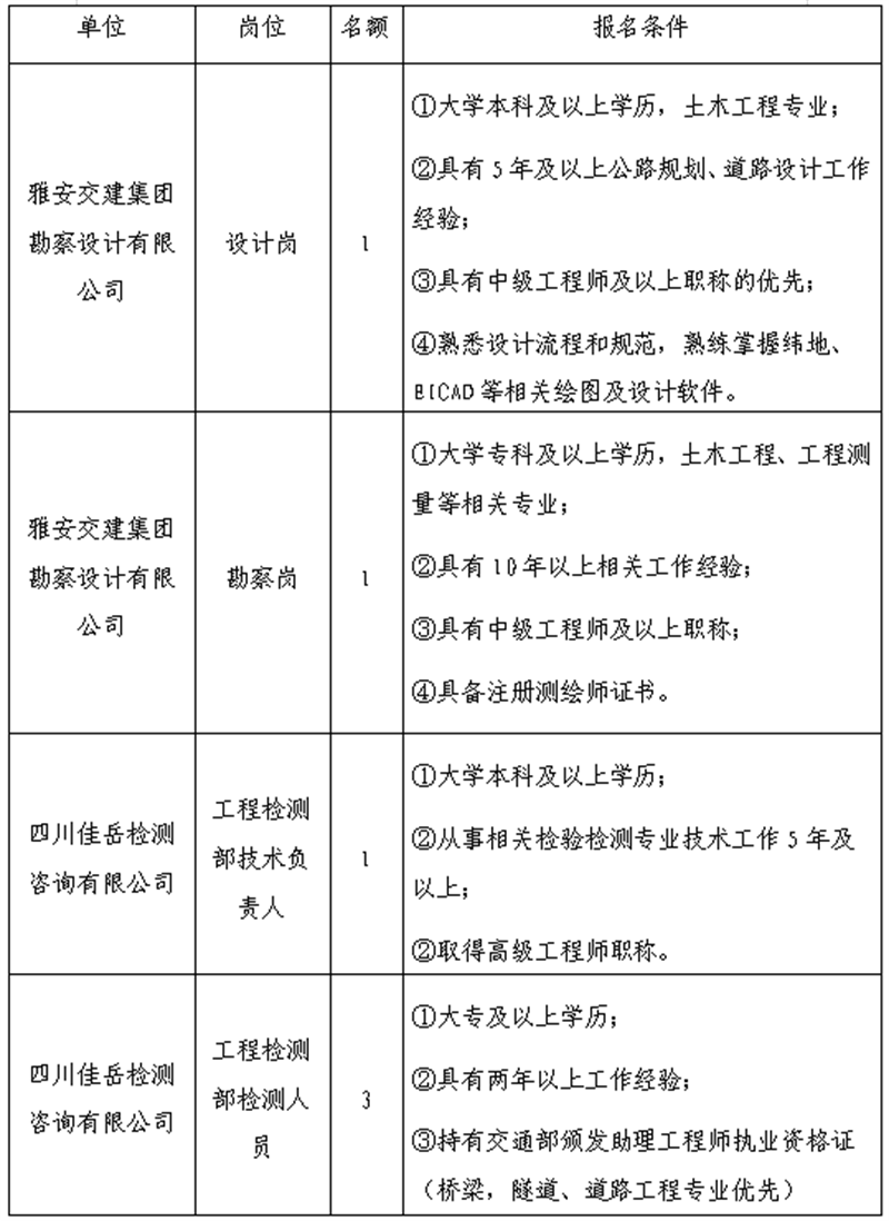 根據(jù)發(fā)展需要,決定面向社會公開招聘雅安市交通建設(集團)有限責任公司(以下簡稱“雅安交建集團”)所屬子公司工作人員6名,現(xiàn)將有關事項公告如下:
