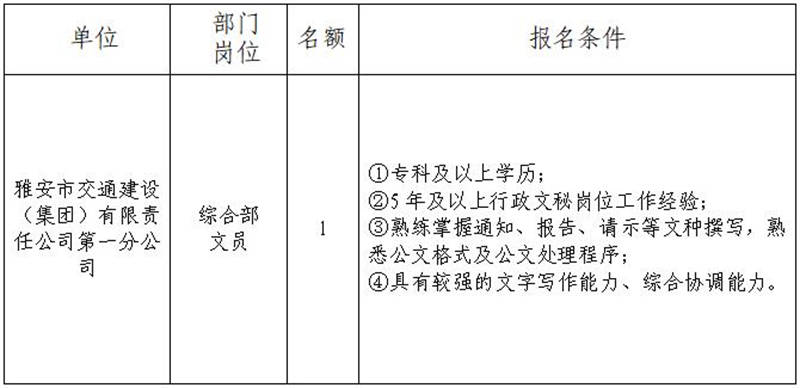 根據發(fā)展需要,決定面向社會公開招聘雅安市交通建設(集團)有限責任公司(以下簡稱“雅安交建集團”)所屬分公司工作人員1名,現將有關事項公告如下: