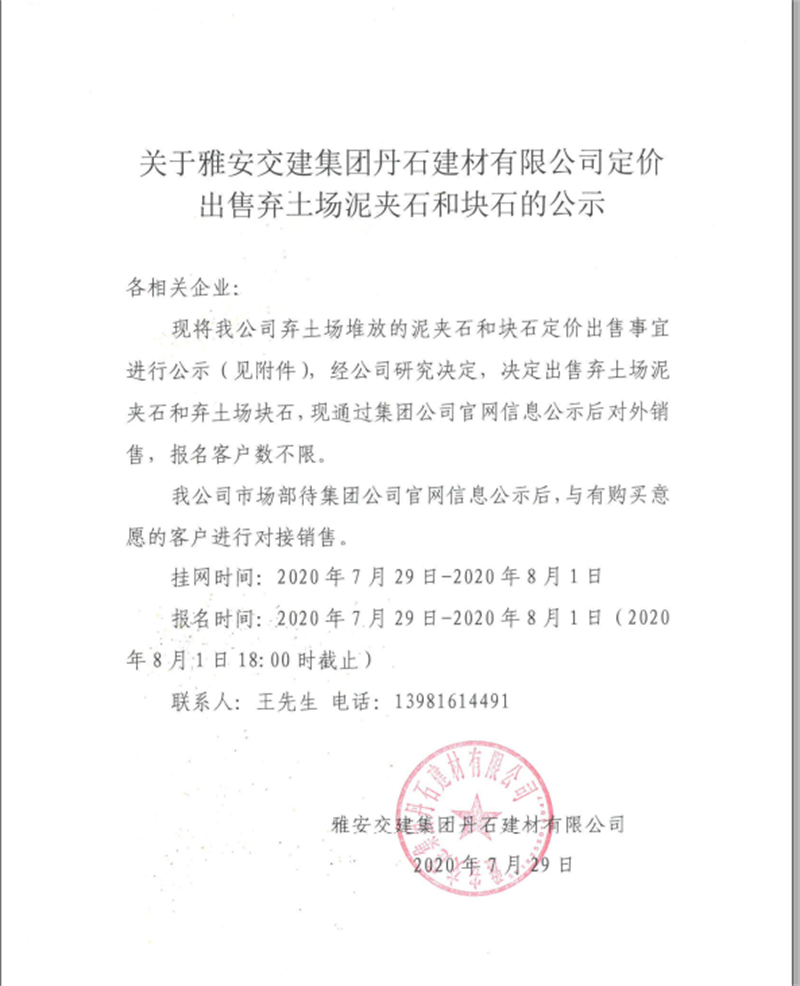 關(guān)于雅安交建集團丹石建材有限公司定價出售棄土場泥夾石和塊石的公示