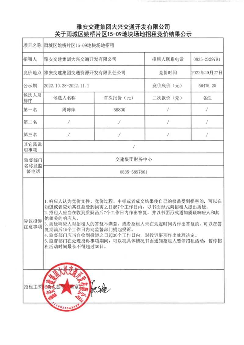 雅安交建集團大興交通開發(fā)有限責任公司關于雨城區(qū)姚橋片區(qū)15-09地塊場地招租競價結果公示