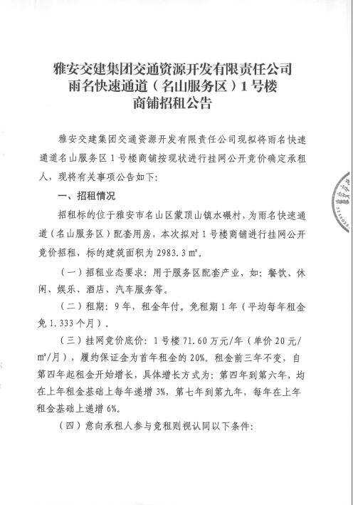 雅安交建集團(tuán)交通資源開發(fā)有限責(zé)任公司雨名快速通道名山服務(wù)區(qū)1號(hào)樓招租公告