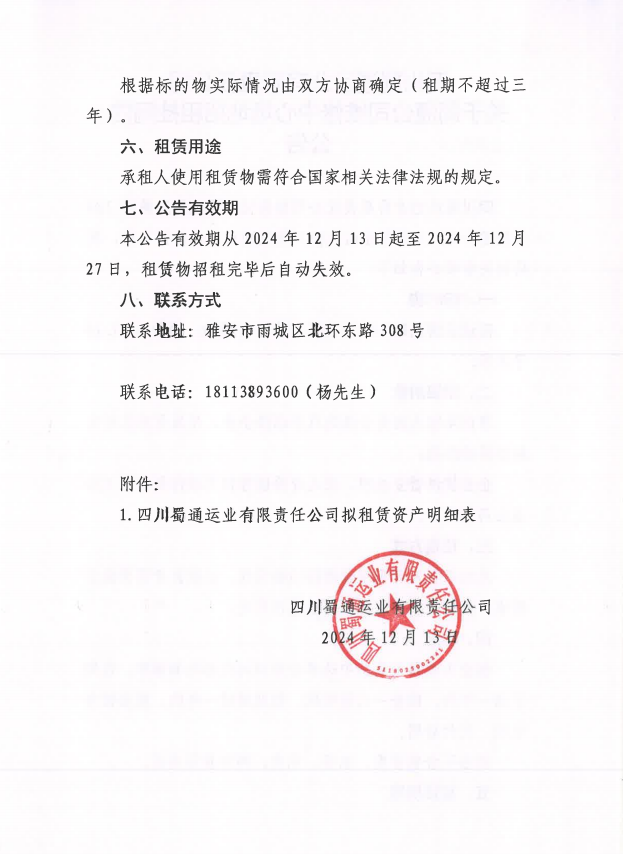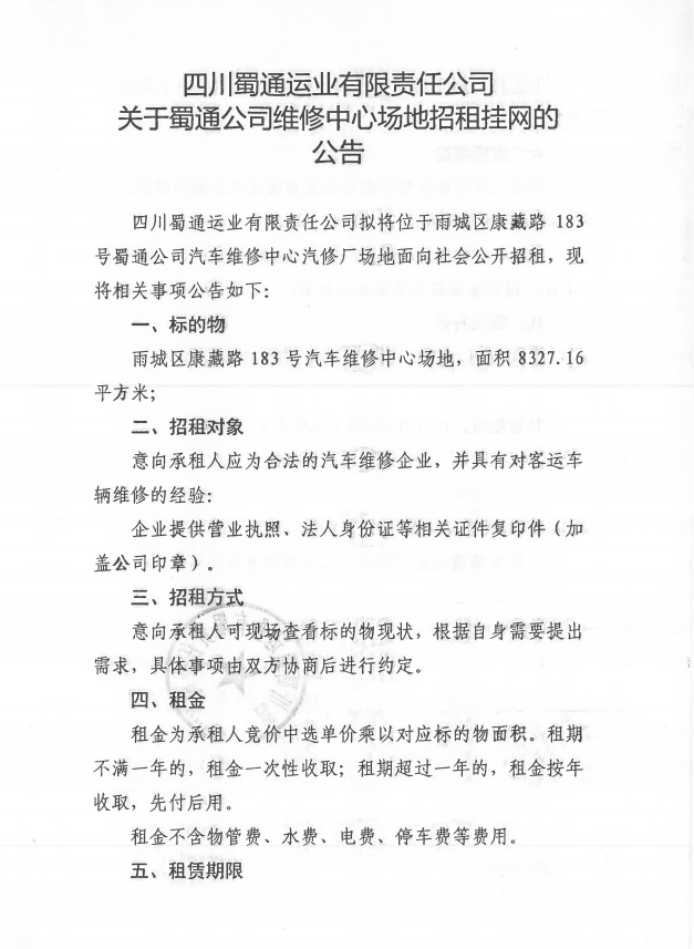 四川蜀通運業(yè)有限責任公司 關于蜀通公司維修中心場地招租掛網(wǎng)的 公告