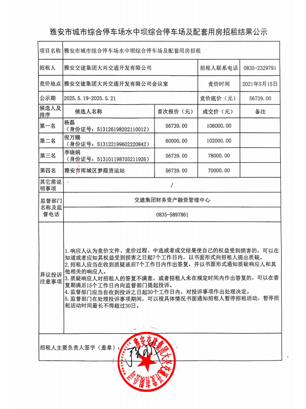 雅安市城市綜合停車場水中壩綜合停車場及配套用房招租結(jié)果公示