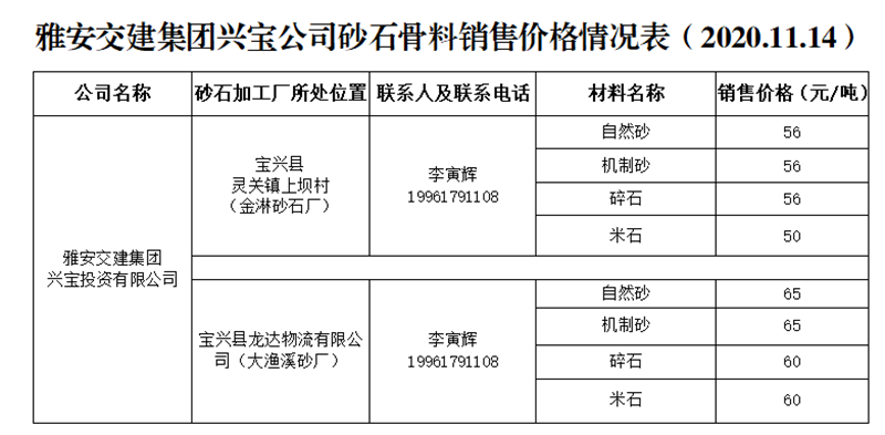 雅安交建集團(tuán)興寶公司砂石骨料銷售價(jià)格情況表(2020.11.14)