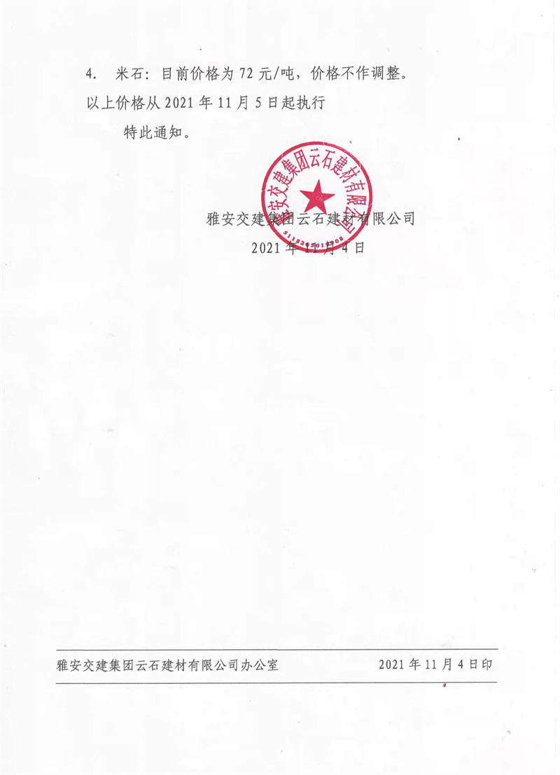 ÑŰ²½»½¨¼¯ˆFÔÆÊ¯¹«Ë¾êPÓÚÕ{Õû³ÉÆ·ÁÏäNÊÛƒr¸ñµÄ֪ͨ£¨2021.11.4£©