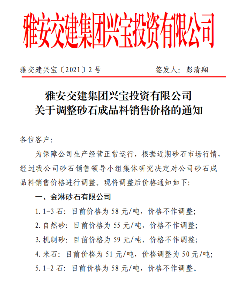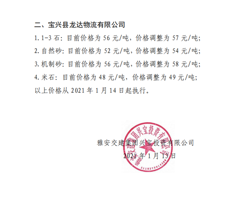 雅安交建集團(tuán)興寶公司砂石骨料銷(xiāo)售價(jià)格情況表(2021.1.14)