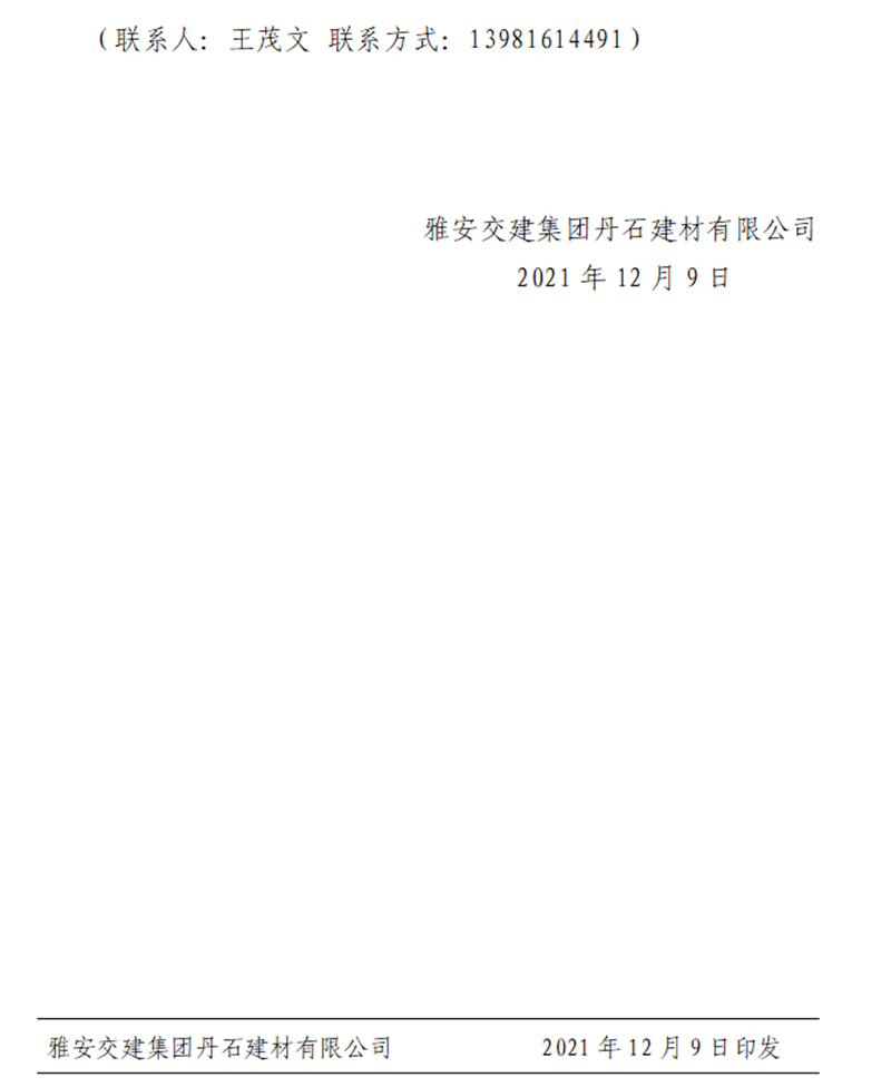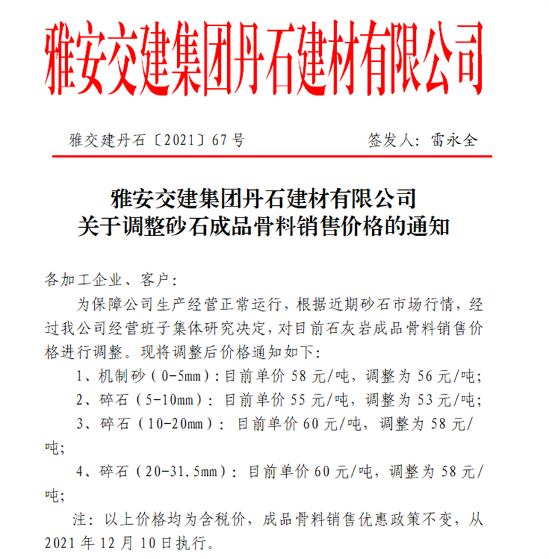 雅安交建集團(tuán)丹石公司關(guān)于調(diào)整砂石成品骨料銷(xiāo)售價(jià)格的通知(2021.12.9)