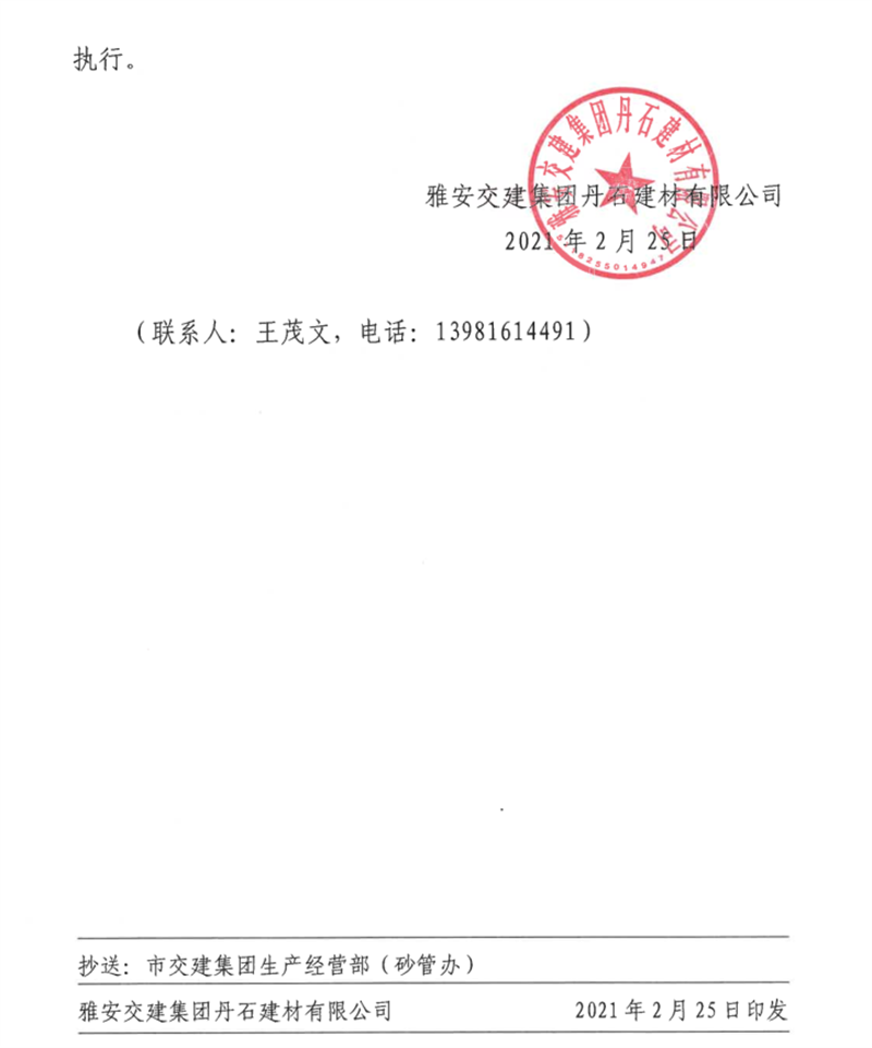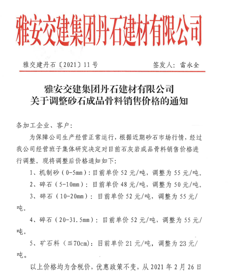雅安交建集團(tuán)云石公司砂石骨料銷售價格情況表(2021.6.20)