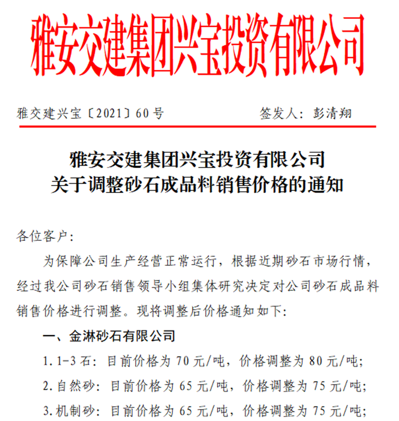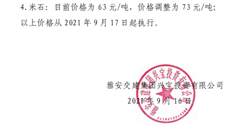 雅安交建集團云石公司關于調(diào)整成品料銷售價格的通知(2021.9.13)