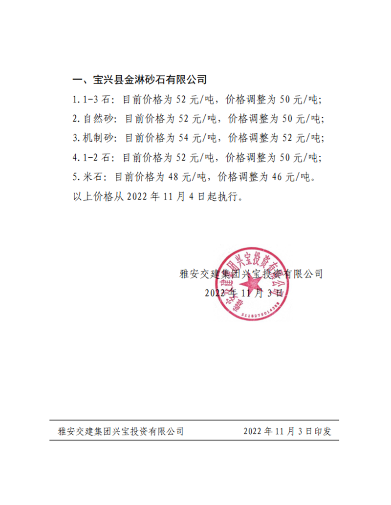 雅交建興寶〔2022〕55號(hào) 關(guān)于調(diào)整砂石成品料銷售價(jià)格的通知-11.5