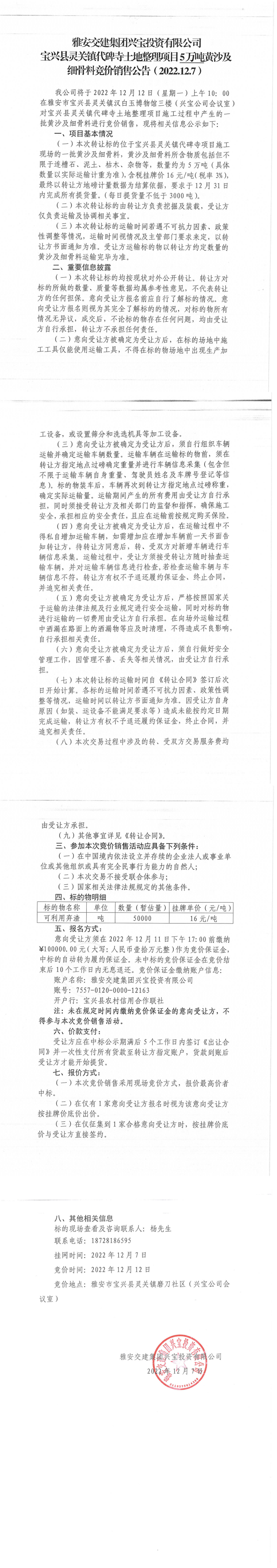 雅安交建集團興寶投資有限公司寶興縣靈關鎮(zhèn)代碑寺土地整理項目5萬噸黃沙及細骨料競價銷售成交公告(2022-12-12)