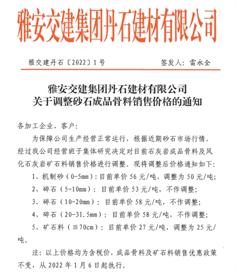 雅安交建集團(tuán)丹石公司關(guān)于調(diào)整砂石成品骨料銷售價(jià)格的通知(2022.1.5)