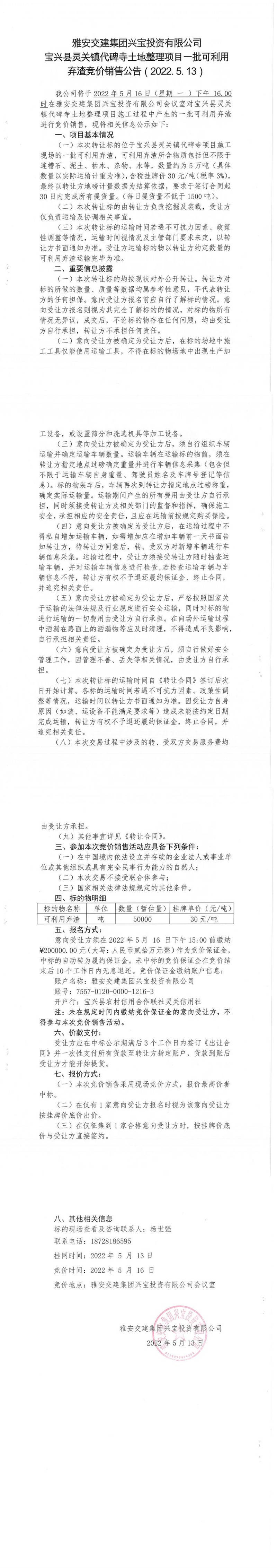 雅安交建集團(tuán)興寶投資有限公司寶興縣靈關(guān)鎮(zhèn)代碑寺土地整理項(xiàng)目一批可利用棄渣竟價(jià)銷售公告(2022.5.13)