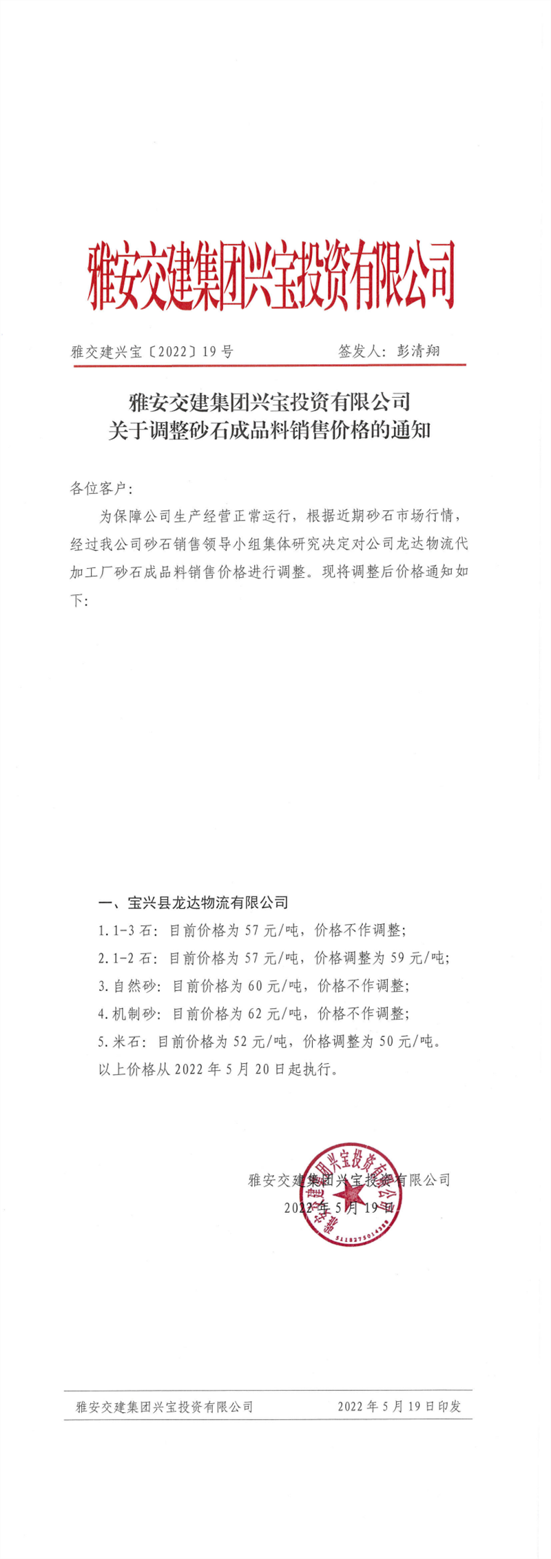 雅安交建集團(tuán)興寶公司關(guān)于調(diào)整砂石成品料銷售價(jià)格的通知-2022-5-19