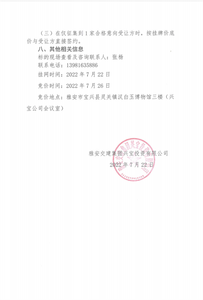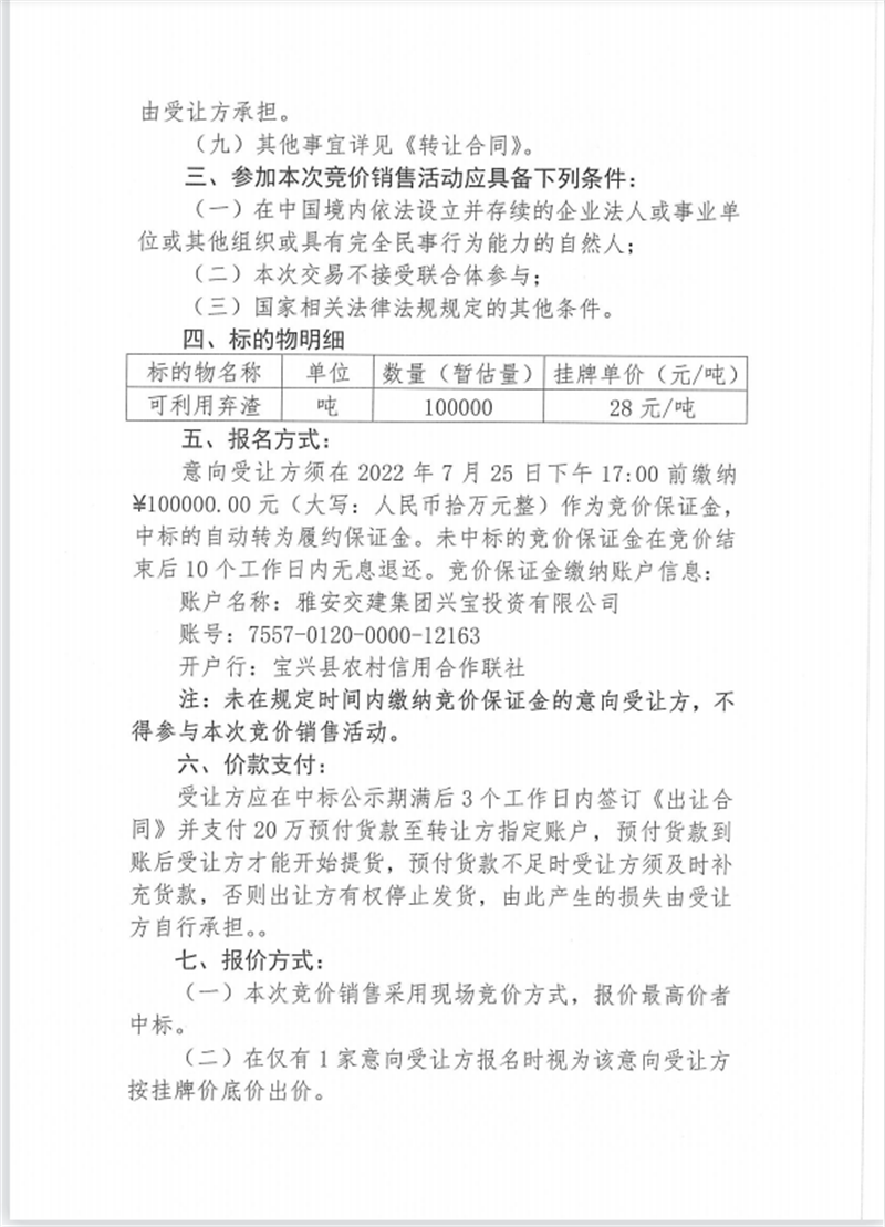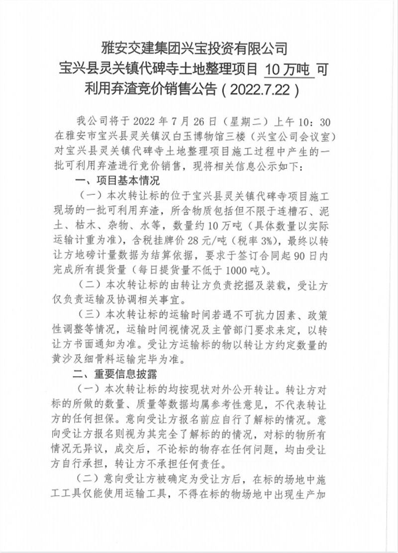 興寶公司寶興縣靈關(guān)鎮(zhèn)代碑寺土地整理項(xiàng)目10萬噸可利用棄渣競價銷售掛網(wǎng)公告掛網(wǎng)公告7.22(5萬噸)