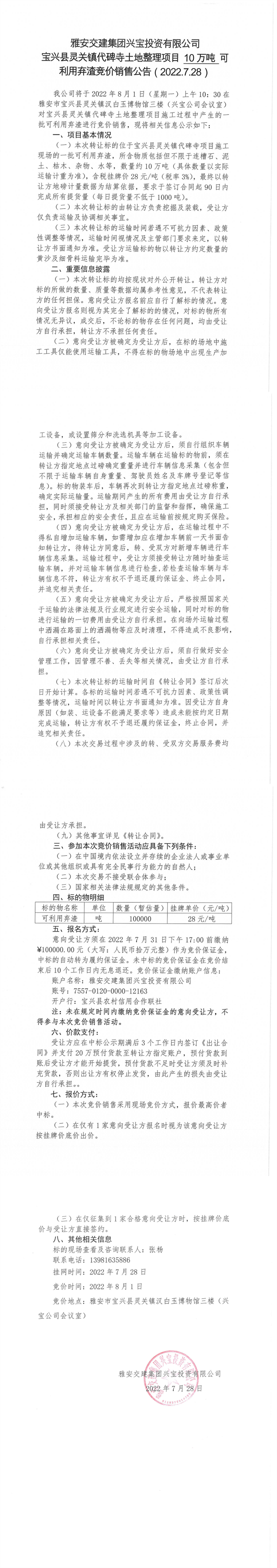 雅安交建集團(tuán)興寶投資有限公司靈關(guān)鎮(zhèn)代碑寺土地整理項(xiàng)目10萬噸可利用棄渣競(jìng)價(jià)銷售公告(2022.7.28)