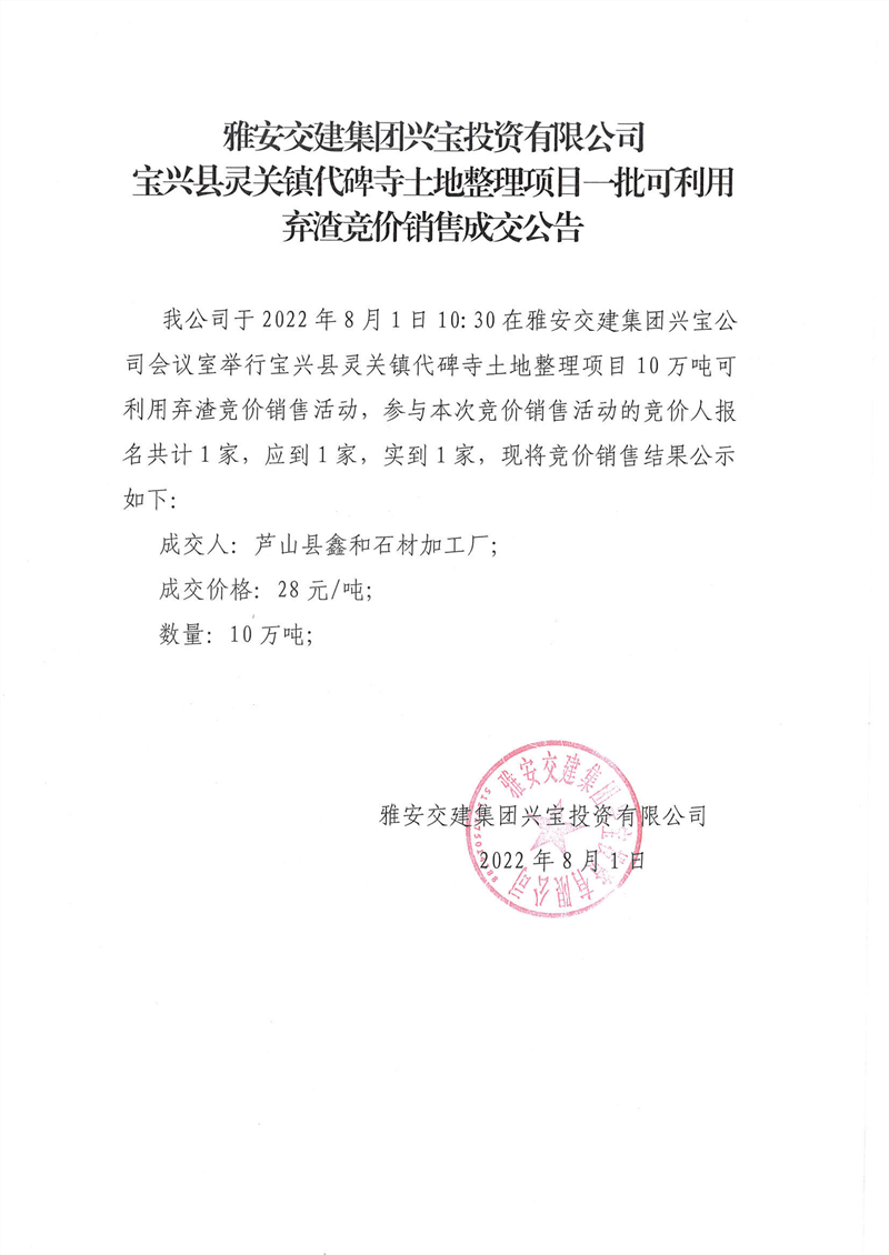 雅安交建集團興寶投資有限公司靈關鎮(zhèn)代碑寺土地整理項目5萬噸可利用棄渣競價銷售成交公告(2022.8.1)