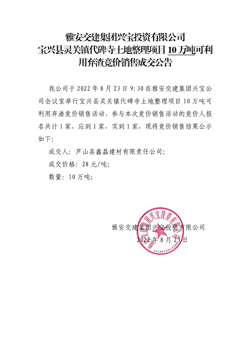 雅安交建集團(tuán)興寶投資有限公司寶興縣靈關(guān)鎮(zhèn)代碑寺土地整理項(xiàng)目10萬噸可利用棄渣競(jìng)價(jià)銷售成交公告(8.23)