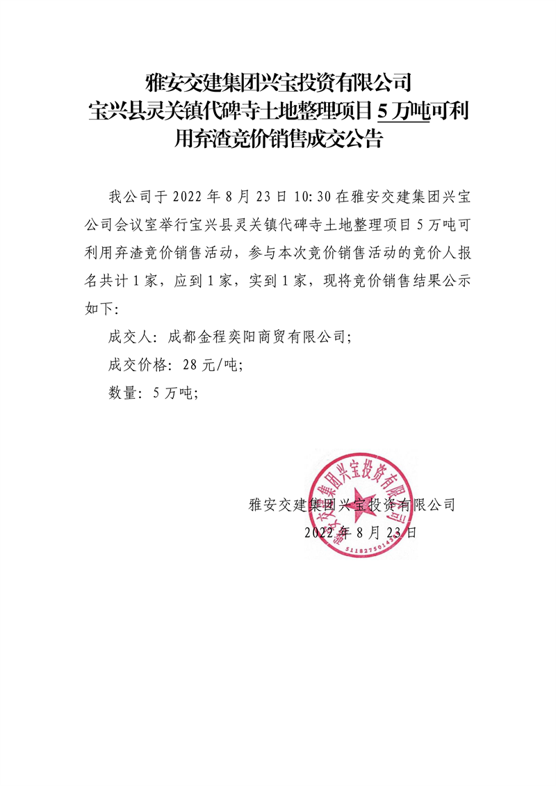 雅安交建集團興寶投資有限公司寶興縣靈關鎮(zhèn)代碑寺土地整理項目5萬噸可利用棄渣競價銷售成交公告(8.23)