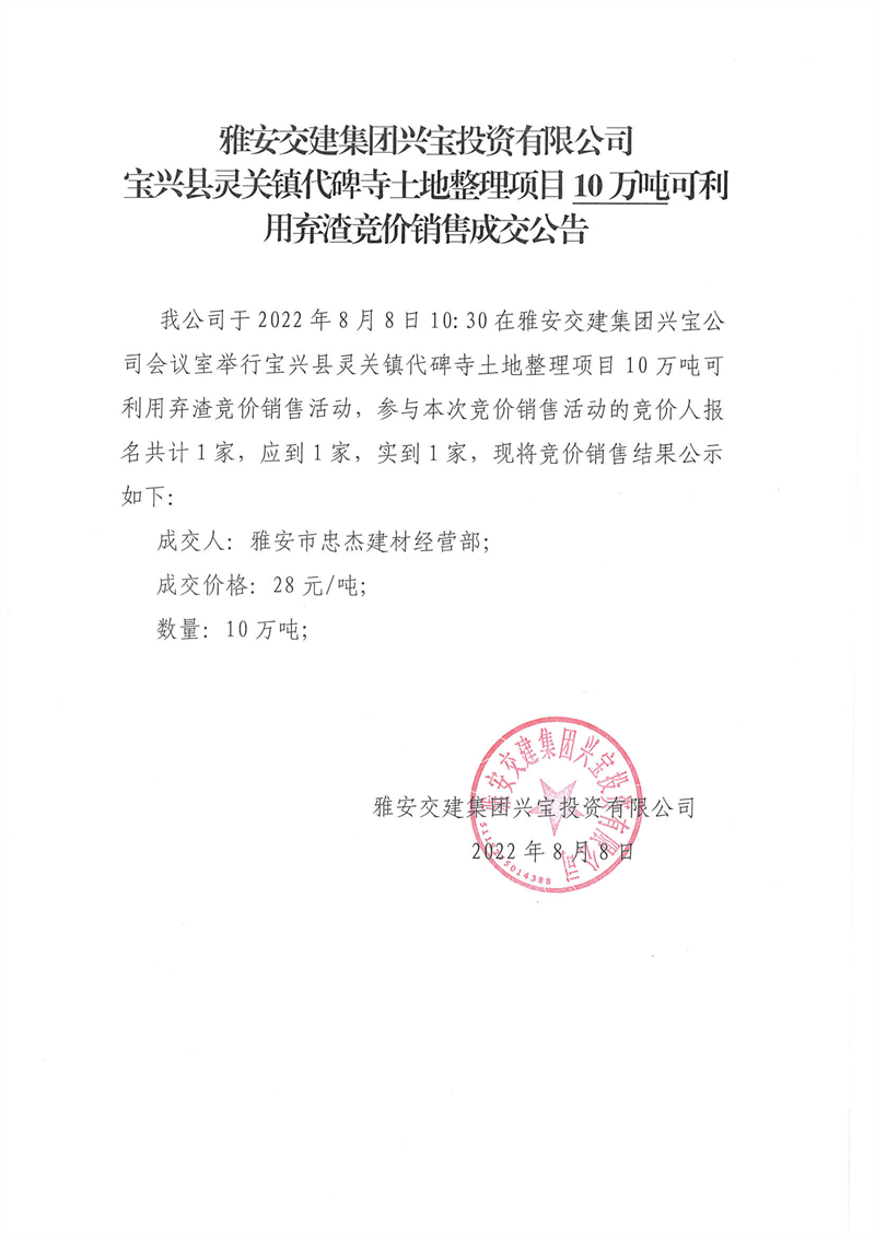 代碑寺土地整理項(xiàng)目10萬(wàn)噸可利用棄渣競(jìng)價(jià)銷(xiāo)售成交公告
