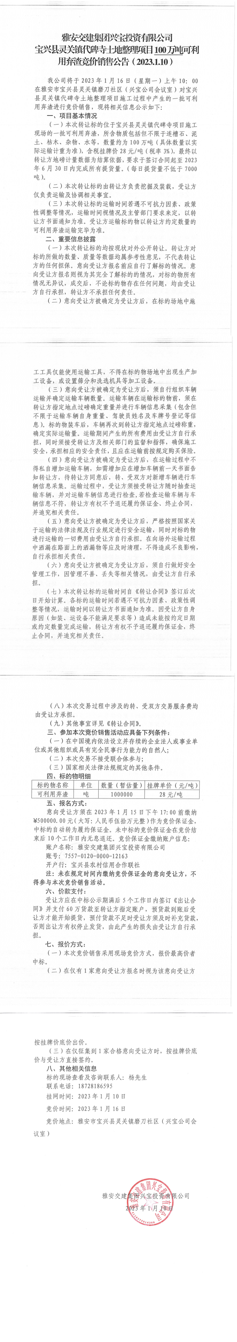 雅安交建集團(tuán)興寶投資有限公司靈關(guān)鎮(zhèn)代碑寺土地整理項(xiàng)目100萬(wàn)噸可利用棄渣競(jìng)價(jià)銷售公告(2023.1.10)