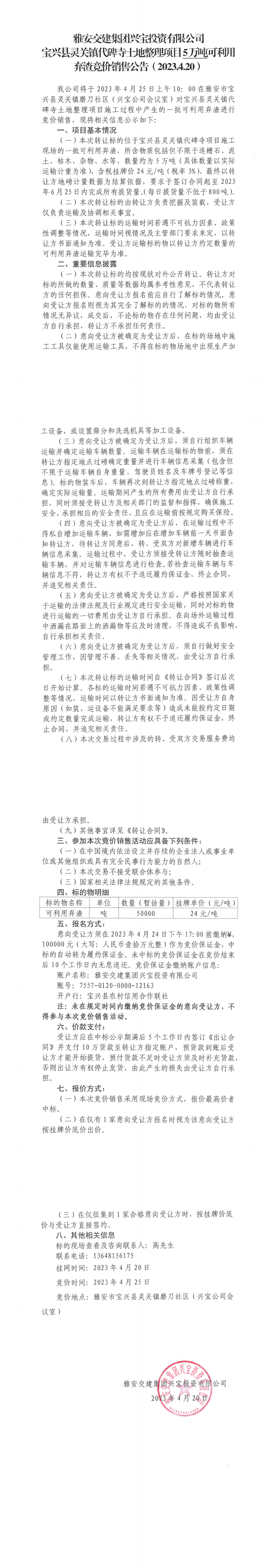 雅安交建集團(tuán)興寶投資有限公司靈關(guān)鎮(zhèn)代碑寺土地整理項(xiàng)目5萬噸可利用棄渣競價(jià)銷售公告(2023.4.20)