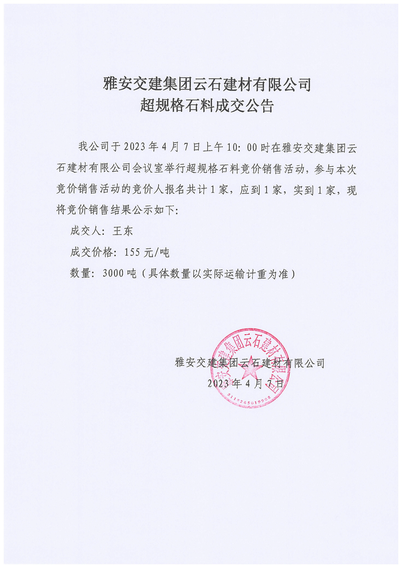 ÑŰ²½»½¨¼¯ˆFÔÆÊ¯½¨²ÄÓÐÏÞ¹«Ë¾³¬ÒŽ(gu¨©)¸ñʯÁÏÅÄÙu³É½»¹«¸æ£¨2023-4-7£©