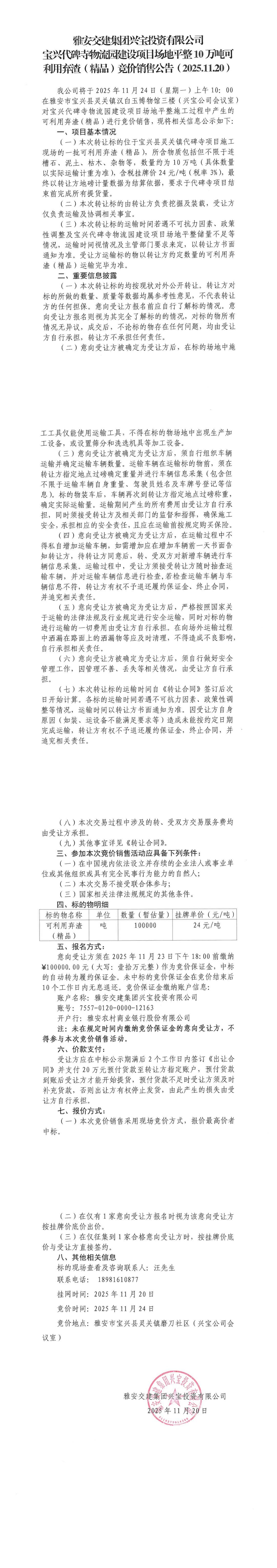 雅安交建集團(tuán)興寶投資有限公司寶興代碑寺物流園建設(shè)項(xiàng)目場地平整10萬噸可利用棄渣(精品)競價(jià)銷售公告(2025.11.20)