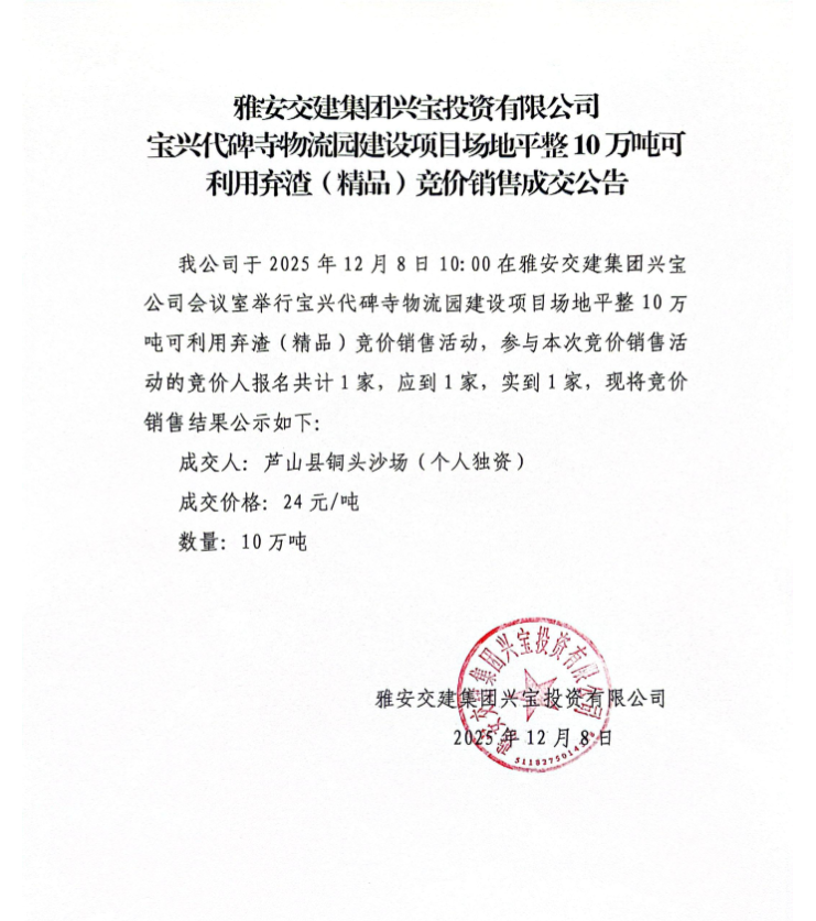 雅安交建集團(tuán)興寶投資有限公司10萬噸可利用棄渣(精品)競價(jià)銷售掛網(wǎng)公告(2025.12.04)