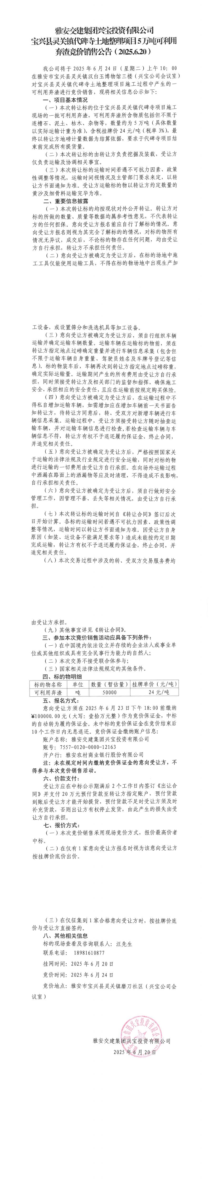 雅安交建集團興寶投資有限公司寶興縣靈關(guān)鎮(zhèn)代碑寺土地整理項目5萬噸可利用棄渣競價銷售公告